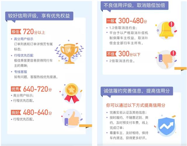 据嘀嗒出行介绍,平台将根据信用分等级动态调控服务政策。用户取得较好的信用评级可享有高分用户标识、行程优先匹配、专线客服等优先权益。若用户信用评级过低,也会受到平台惩罚,如车主信用分低于300分,将被限制接单次数;乘客信用分低于300分将需支付2倍取消违约金,以此激励用户良好履约取得高信用分,建立和谐友好地合乘关系。