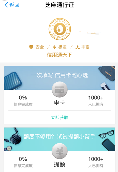 首先打开芝麻信用首页中的信用管理模块,我们可以看到暂时只用卡申请和提额两个通行证可以申请获取。