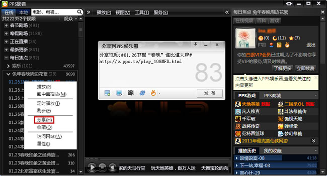 分享视频。在PPS影音左侧列表任意一节目上点击右键,快捷菜单中选择分享,微博发布工具将自动把此条视频的名称及播放地址填写在发布框中,点击发布即可在娱乐圈中分享此视频。
