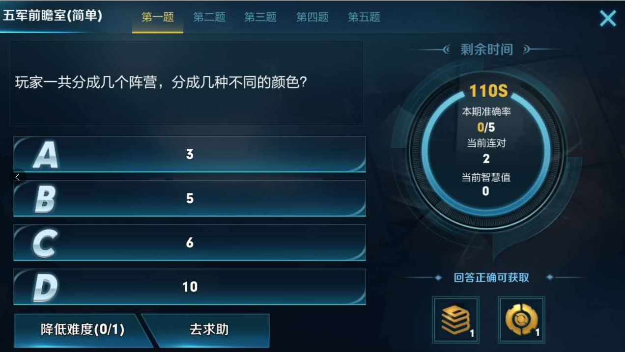 玩家一共分成几个阵营,分成几种不同的颜色?王者荣耀今天的王者知道活动正式开放了,很多玩家都想知道这次的王者知道活动的题目的正确答案,今天小编便给大家带来王者荣耀五军前瞻室难度题目的正确答案,一起来看看吧。