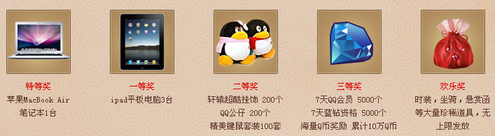 2.获得Q币,会员,蓝钻和苹果电脑,吊牌,公仔等奖励的玩家,需要到官网登记邮寄地址和联系方式,奖品会在活动结束后统一寄出。