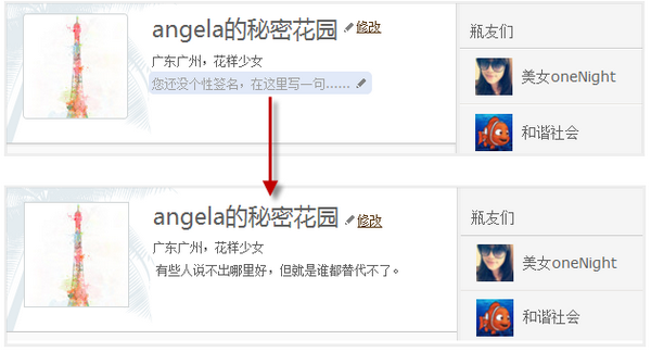 漂流瓶里支持个性签名啦。这里是你的心情写照,也可以是你兴趣爱好的缩影。