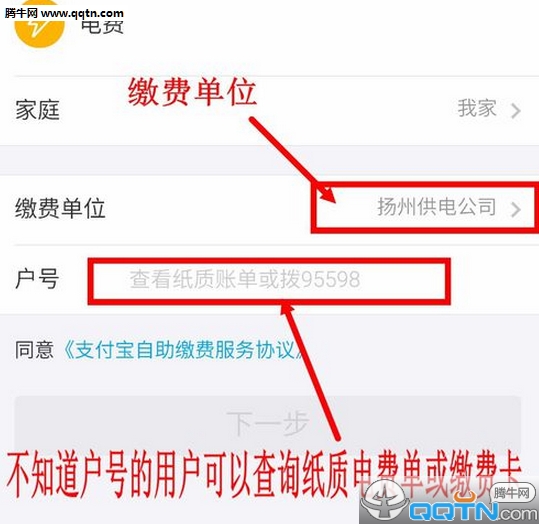 点击缴费单位就可以变更各地区的供电公司,这就方便外地游子为父母缴费了。不知道自己家户号的用户可以查看家里的电费账单或者缴费卡(江苏的是十位数,不足十位的请在前面加9)。输入完毕后点击下一步。