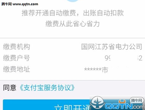 先是服务授权,核对好自己的账号、姓名、家庭住址后选择立即开通。开通时要输入支付宝6位密码进行确认。确认完成后会显示自动缴费办理成功。