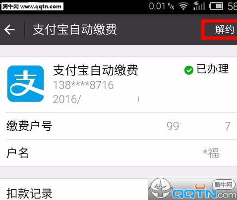 如果想解约请点击右上角的解约按钮(提别提醒:只有通过这个方式才是解约,不然代扣服务是不会关闭的!!)。解约完成后会通知你解约完成!