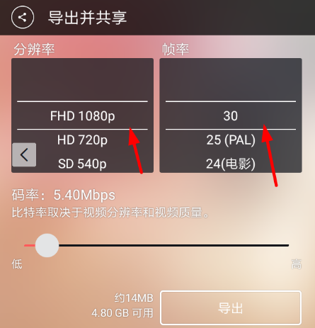 3、从中将分辨率滑动到最上方,就可以把导出的视频修改为1080P的分辨率,而且将帧率提升至30帧的话,也能够提高画面的质量!