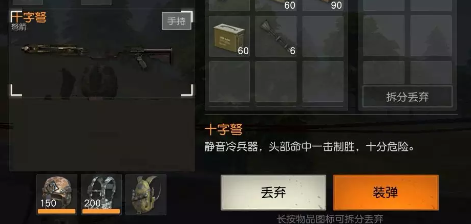 十字弩后,点开背包,点击十字弩,我们已经能从介绍文字中看出端倪:静音冷兵器,头部命中一击制胜,十分危险。