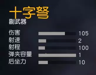 十字弩基础数据,与枪相仿,但射程稍弱,比较适合巷战、埋伏,或者地形具有高低差的对峙。