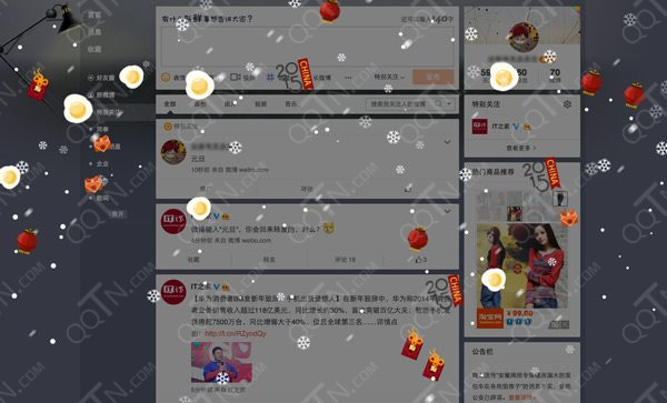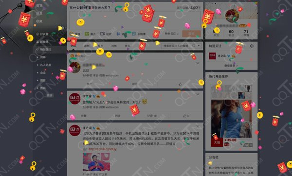 新越来越时尚了!不仅在圣诞节的时候设计小彩蛋,就连元旦也设计了,只要在发微博时输入元旦或新年的关键词即可看到首页飘下鸡蛋、红包、灯笼等,超级唯美新颖哦!
