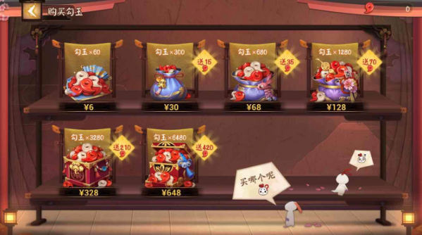 勾玉是中最重要的游戏货币,也就是充值才能获得。1块钱等于10勾玉,首冲是6块钱,也就是60勾玉。