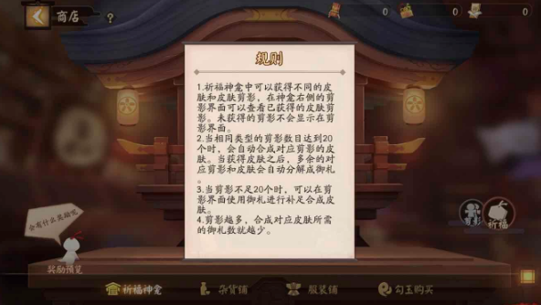 祈福神龛有点类似王者荣耀中的英雄和皮肤碎片,当碎片达到一定数量后,就可以直接兑换式神和皮肤了。