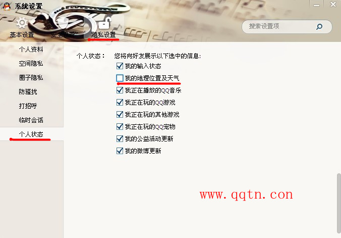 三、在“隐私设置”页面中,选择“个人状态”选项,去掉“我的地理位置及天气”前的钩就可以了。这时你的qq地理位置就隐藏了。如图: