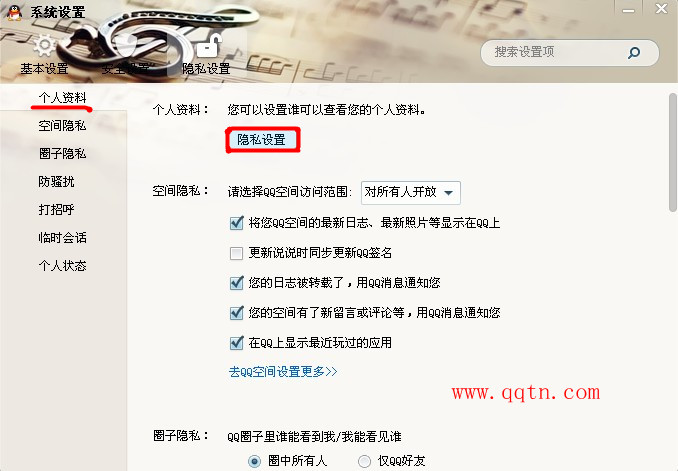 四、当然你的个人资料上也会有你的所在地,你也可以对它进行设置。在“隐私设置”页面中,点击“隐私设置”按钮,如图: