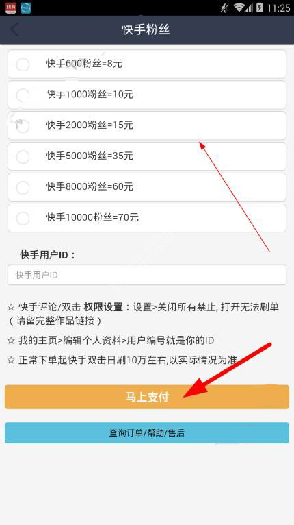 选择刷粉丝量,输入快手用户id,点击“马上支付”即可大功告成。