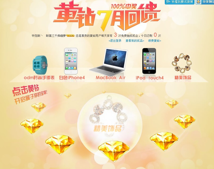 3.活动方式:点击“黄钻”即可抽奖,所有奖品都是随机获得。