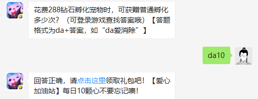 花费288钻石孵化时,可获赠普通孵化多少次?(可登录游戏查找答案)【答题格式为da+答案,如“da爱消除”】在天天爱消除手游中,玩家其实是可以通过使用钻石来提升自己的宠物孵化的,很多玩家也都会选择使用钻石来提升自己的宠物孵化速度,但是花费288钻石孵化宠物时可获赠普通孵化多少次?很多玩家就不是特别了解了,今天小编便给大家带来天天爱消除手游钻石孵化宠物的问题的回答,一起来看看吧。