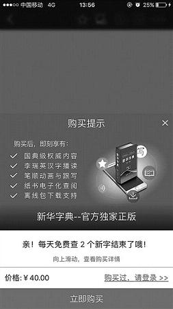 但免费版APP每天只能查询2个汉字的情况却引起了争议。北京青年报记者发现,在查询2个字后,APP便弹出提示要求购买完整版,购买费用为40元,并称购买后可以享有纸版《新华字典》第11版的完整准确内容;李瑞英汉字发音播读;汉字的规范笔顺动画演示;纸书完整阅读体验;包下载支持等功能。