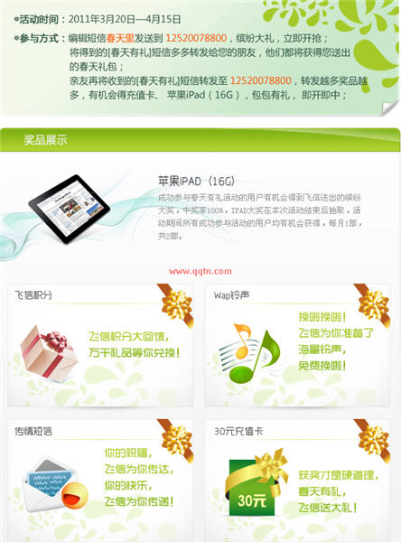 即开即中:免费短信礼包、免费手机来电铃声、飞信积分和手机充值卡。您的好友将[春天有礼]短信转发至12520078800成功后,您与好友即可同时中奖,奖品随机发放,中奖率100%!活动抽奖:活动结束后对所有参与用户进行抽奖,送出两台IPad(16G)大奖。