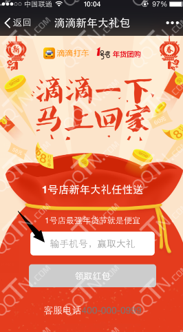 2、只需大家输入手机号,即可100%获得滴滴新年大礼包,一大波打车券和专车券送入你的手机号当中。