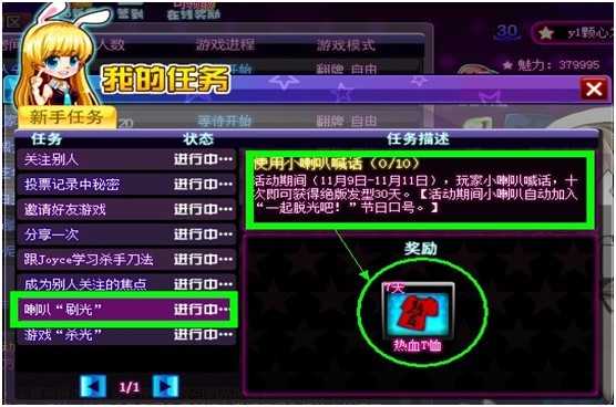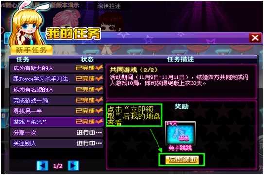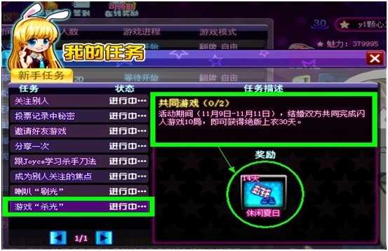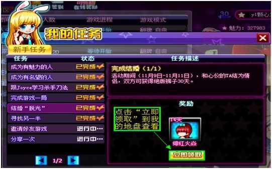 会弹出活动的任务,查看任务条件后就可以去完了哦!!!这个任务很简单哦,其实就是直接和老公或老婆一起玩2局游戏就OK了~当然你想获得奖励的时间更长,付出也是要加倍的哦!!!
