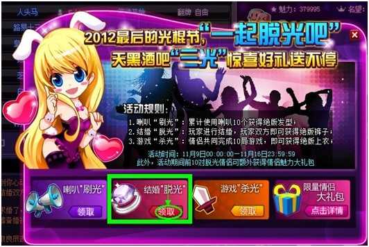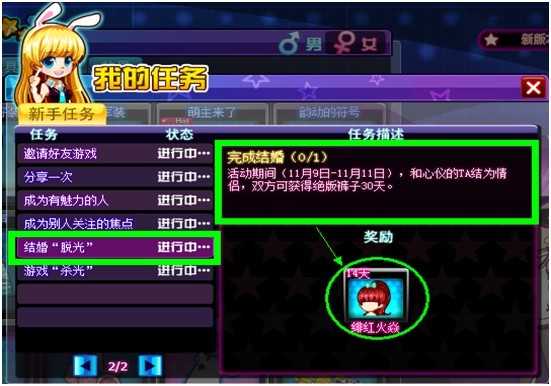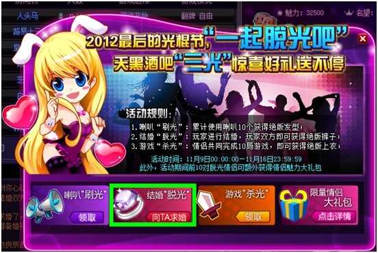 这个活动不得不说很重要,将会影响你是否可以真正意义上的脱光哦!不好意思激动啦忘说活动名称了,名称是“结婚-脱光”。本任务分两个曲,第一是没有女朋友或男朋友的玩家,选择“向TA求婚”。