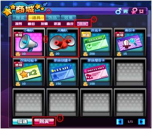 在右边游戏功能区内点击最上面那个“商城”再选择“道具-推荐”或“道具-其他”找到喇叭后点击最下面的购买就OK啦~当然在商城是无法直接使用的,你可以到游戏大厅、游戏房间、休息区、休息区内的房间都可以使用。