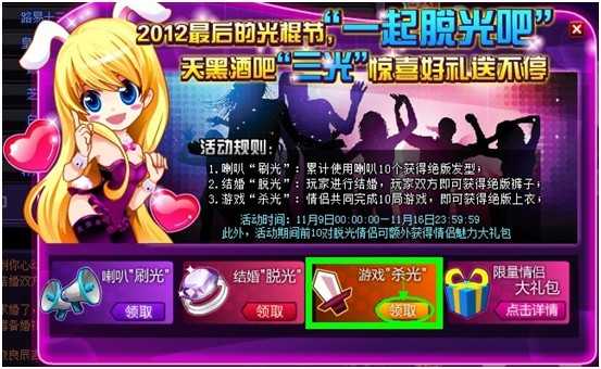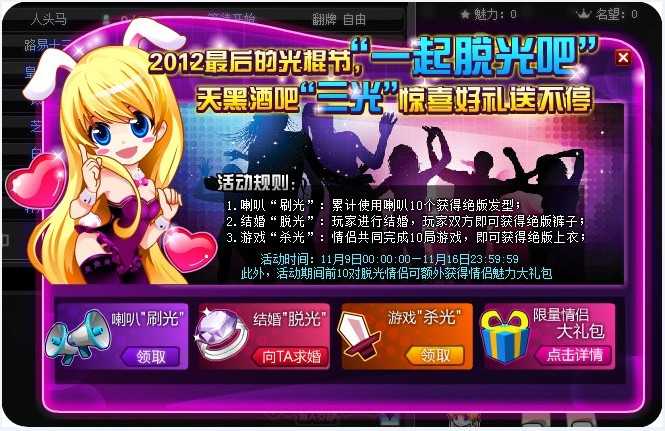 登录游戏后,发现出现了如下活动窗口,光棍节期间,一共有四个活动可以参加,下面给大家介绍一下。