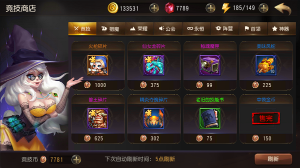 商店每次统共分为八大类,每类每次刷新8个物品。卖掉的商品会显示“售完”字样。