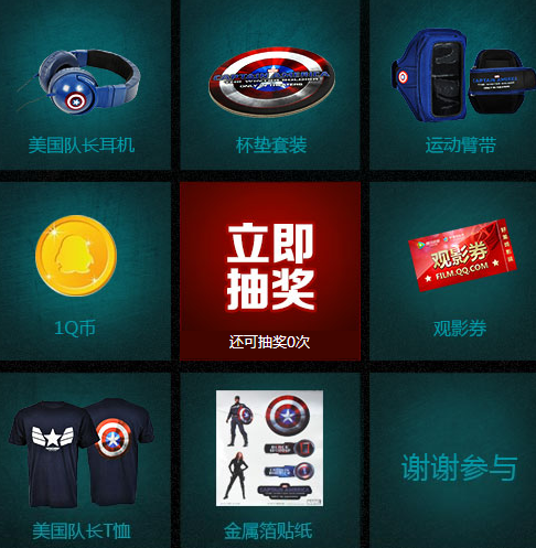 美国队长专属耳机T恤、运动臀带、观影券、Q币等,具体奖品请看截图: