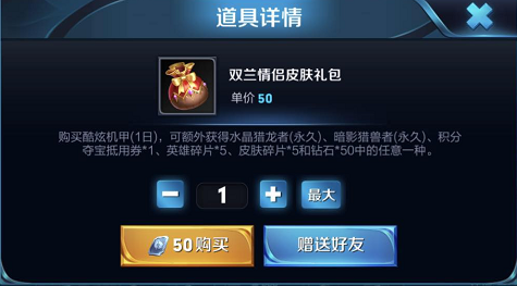 双兰情侣皮肤礼包购买就可以获得炫酷机甲一日,然后有机会额外获得水晶猎龙者皮肤和暗隐猎兽者皮肤,积分夺宝抵用券,还有可能获得5个英雄碎片,五个皮肤碎片或者50钻石。