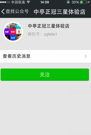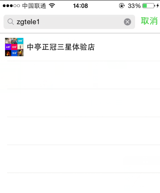 2、查找公众号,输入中亭正冠三星体验店的账号zgtele1