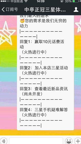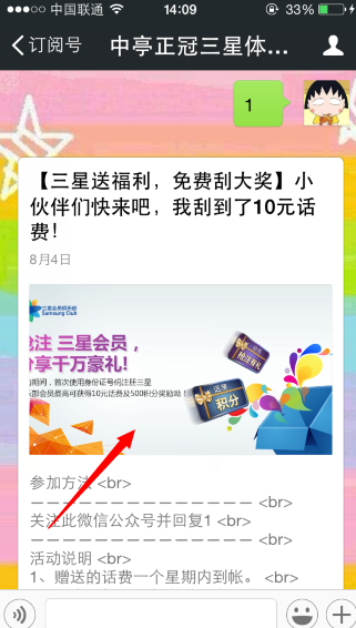微信又出新活动啦,只需关注中亭正冠三星体验店(微信号zgtele1)并可赢取10元话费。虽说中奖率不是100%,但参与即可获得三次刮奖机会的哦!