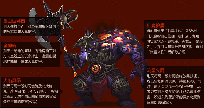 玩家攻击使刑天的血量达到特定的百分比和击杀刑天最后一刀的玩家将获得特殊的奖励。玩家可通过观察界面上的“下次惊喜血量”得知刑天下一次的惊喜血量百分比。