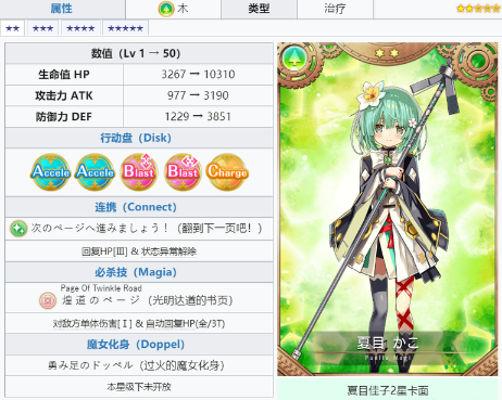木属性治疗型,盘型AABBC中规中矩,既能状态解除又能回血的奶妈,能解除控场效果的属性优秀性能,如果开局没小圆的情况下,夏目可说是对萌新十分友好的卡。