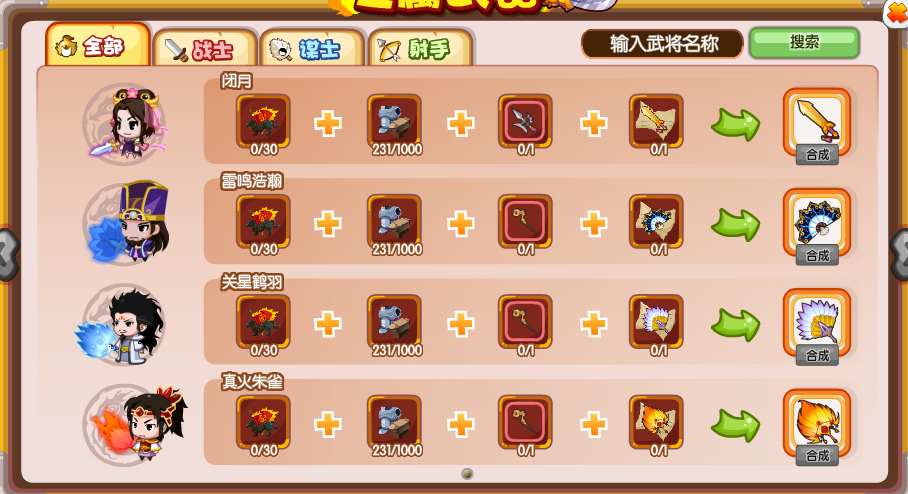 材料:虎符x30,强化上限符x999,对应40级红色武器配方,专属武器配方
