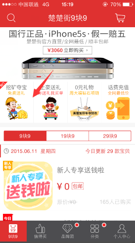 1、首先,需要下载楚楚街app,成功安装以后的用户,在打开app首页即可看到挖矿夺宝活动入口;