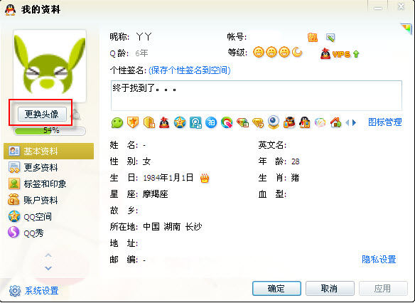 1、我们双击自己的QQ头像,进入“我的资料”,然后点“更换头像”