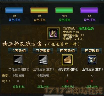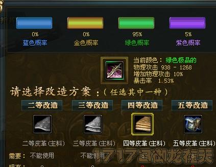 这个改造有百分之5的几率,但是要的材料也很多,以90级的副手为例,就要4个皮革,而90级的武器就要8个。不过这个比打造的材料要少,但也不推荐,因为改造的话名将就没了,推荐改造副手。