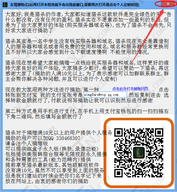首次启动本辅助会跳出“友情赞助”页面,这属自愿行为,你完全可以不用,100%免费使用