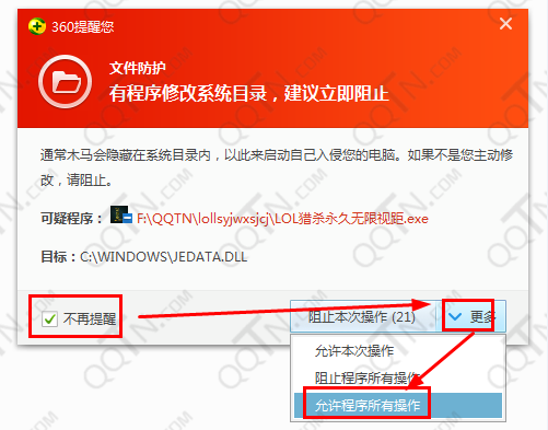 后运行“LOL猎杀永久无限视距.exe”程序,360会阻止插件修改相应文件,勾选“不再提醒”,选择“更多”,点击“允许程序所有操作”