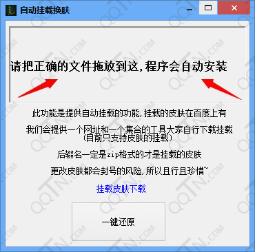 将下载的皮肤文件拖到上方的框框内就会自动安装到游戏内(前提是,,下载好的!!!)