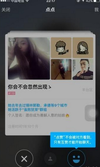 4、点赞的话是不会被对方看到的,只有互相点赞了才能聊天哦!说明你俩是互相中意的!