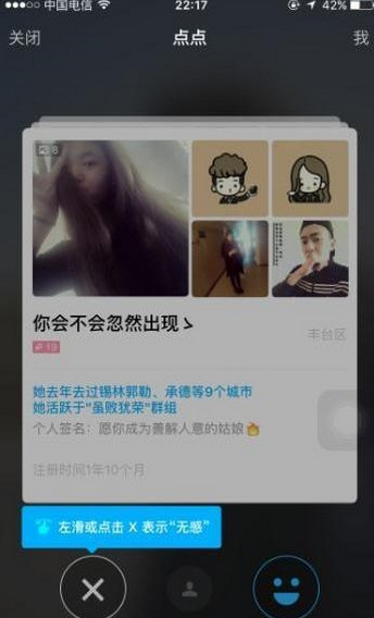 2、在这里你会看到各种陌陌的名片,左滑或者点击叉号表示无感!