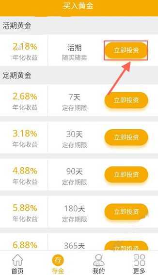 1、打开app,在【存金】栏目的【存入黄金】页面点击【立即投资】按钮进入;