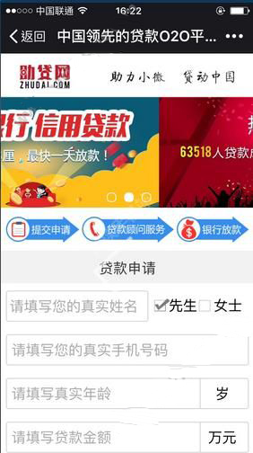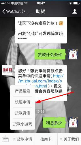 第一步:首先您可以通过微信关注公众号“助贷”,然后在贷款申请那里,选择【快速申请】。