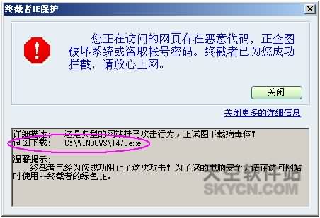 由于在金钱利益的驱动下,很多黑客或网站会对网站进行挂马,从中获取不法之财。因此,在此提醒各位网友一定要提高网络安全防护意识,在上网时,一定要开启安全软件,最好安装具有主动功能的抗病毒软件,对病毒进行事前防患。