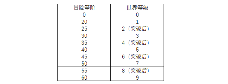 PS:表格中的“突破后“意为到达对应冒险等阶后需要完成一个特殊的突破关卡才可提升世界等级。若不完成突破关则世界等级与冒险等阶锁定,但冒险经验仍可继续积攒。