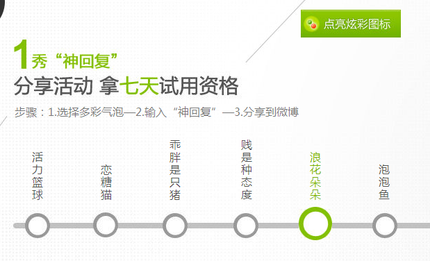 2.进入活动页面的用户都可点亮客户端个签炫彩图标,参与秀“神回复”,分享微博拿气泡体验资格。