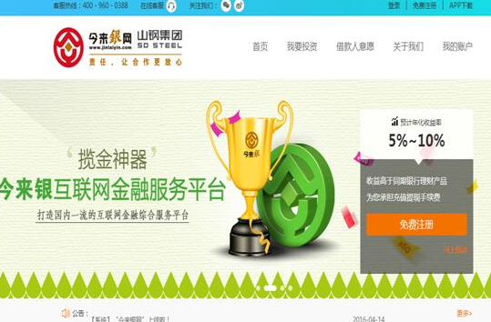 3、今来银网依托特国企山钢集团信用保障,以“责任,让合作更放心”为宗旨,融合金融行业优势资源,打造国内一流的互联网金融综合服务商。用户可以直接通过手机APP浏览标的,并且进行注册,登陆,充值,投资,提现等业务。