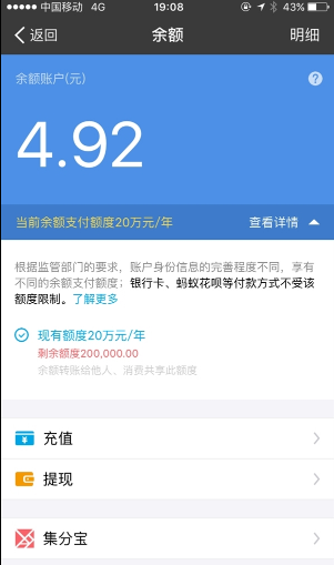 昨日,iOS版支付宝迎来更新,在“余额”部分加上了一段,具体就是使用余额支付有限额了,分为1000元/终身、10万/年、20万/年三种额度,分别对应三类帐户。